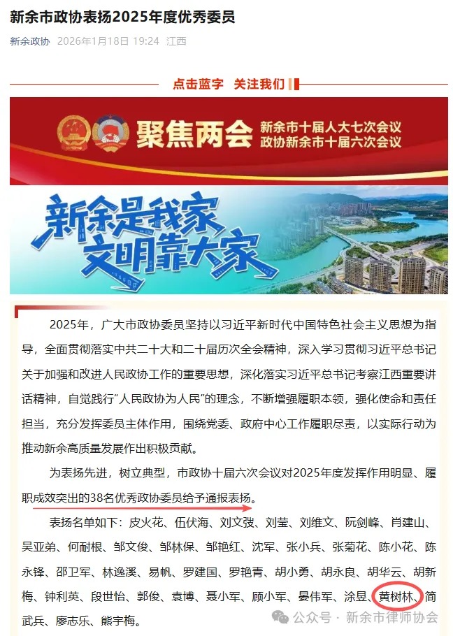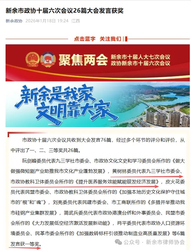 近日,新余市及分宜县政协会议陆续圆满闭幕。新余市黄树林、陈华军两位律师作为政协委员,以高度的社会责任感和专业的法律素养,全程参与各项议程,认真履行职责,荣获多项荣誉,用法治智慧为地方发展建言献策,充分展现了新余律师作为“法治建设助推器、民生诉求发生筒、政府决策智囊团”的重要作用。 黄树林律师作为新余市律师行业参政议政的优秀代表,以扎实的履职表现获评“新余市2025年度优秀政协委员”,其提交的《提升医养服务效能赋能银发经济发展》专题发言,紧扣人口老龄化社会热点,立足新余本地实际,聚焦医养结合体系建设痛点,提出兼具法律保障与实践可行性的解决方案,以专业视角为银发经济发展注入法治动能,最终荣获发言一等奖,得到评审委员会的高度赞誉。这一荣誉既是对黄树林律师个人履职成效的充分肯定,更是对律师群体以法治思维破解社会治理难题的专业认可。